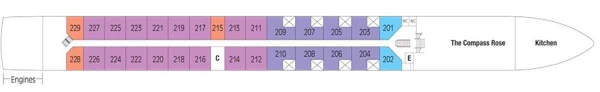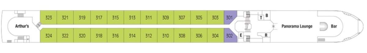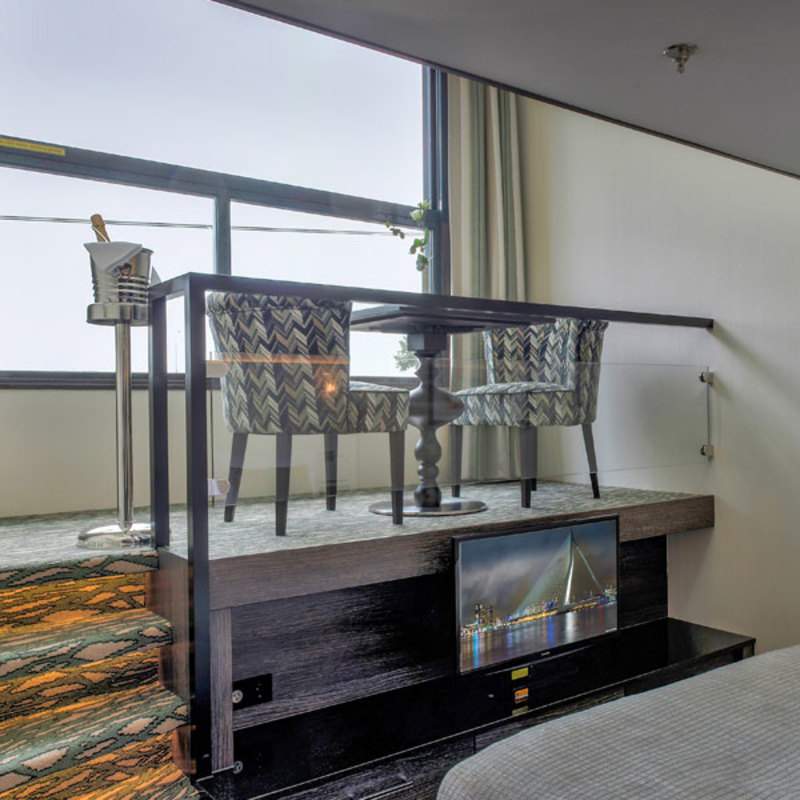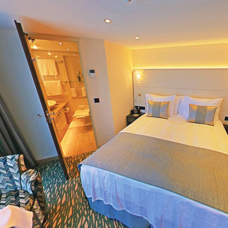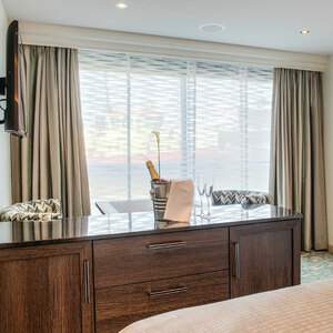 Innovatively designed 225 sq. ft. "split-level" loft cabins, One-and-a-half deck window that opens at the top, electronically controlled, Loft sitting area, Safe, Minibar stocked with complimentary water and soft drinks, replenished daily, 32" LED TV , Window (98 inches x 114 inches) can be partially opened, 220v and 110v outlets in cabin and bathroom, Easy under-bed luggage storage, Telephone and individual climate control, Onboard wi-fi available