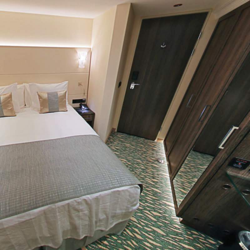 One floor-to-ceiling French Balcony (98 inches wide x 75 inches high) with one sliding door that opens, Minibar stocked with complimentary water and soft drinks replenished daily, 32" LED TV, 220v and 110v outlets in cabin and bathroom, Easy under-bed luggage storage, Telephone, safe and individual climate control, Onboard wi-fi available