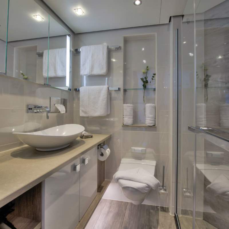 Molton Brown toiletries – a Tauck Exclusive, Terry-cloth bathrobes plus slippers, Full-size bathroom featuring enhanced lighting, additional storage and a hair dryer, Large shower featuring rainfall shower head (note: no bathtub)
