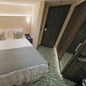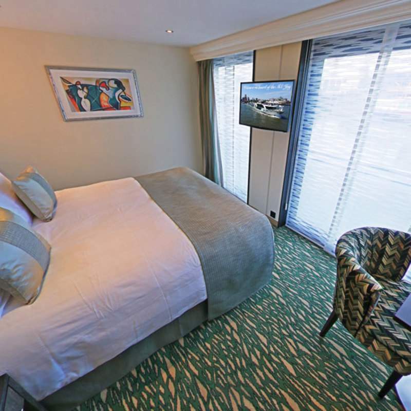 One floor-to-ceiling French balcony (98 inches x 75 inches) with one sliding door that opens, 32" LED TV, Safe, Minibar stocked with complimentary water and soft drinks, replenished daily, 220v and 110v outlets in cabin and bathroom, Easy under-bed, luggage storage, Telephone and individual climate control, Onboard wi-fi available