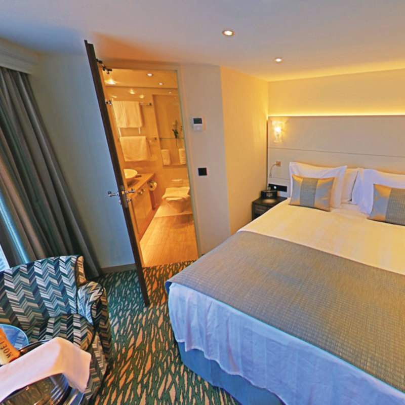 The room also includes a mini-bar stocked with complimentary water and soft drinks replenished daily. Amenities also include a 32” LED TV, two chairs, a built-in closet with drawers, as well as a telephone, safe, and individual climate control. Wi-Fi is also available onboard.