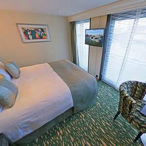 One floor-to-ceiling French balcony (98 inches x 75 inches) with one sliding door that opens, 32" LED TV, Full-sized window (98 inches x 37.5 inches), Minibar stocked with complimentary water and soft drinks, replenished daily, Safe, 220v and 110v outlets in cabin and bathroom, Easy under-bed luggage storage, Telephone and individual climate control, Onboard wi-fi available