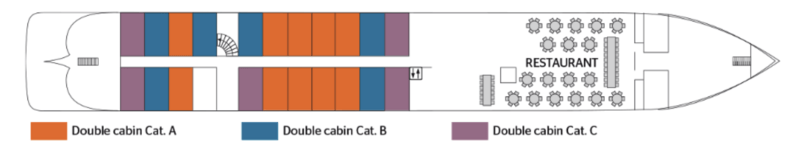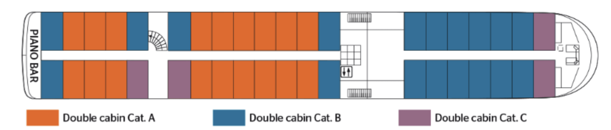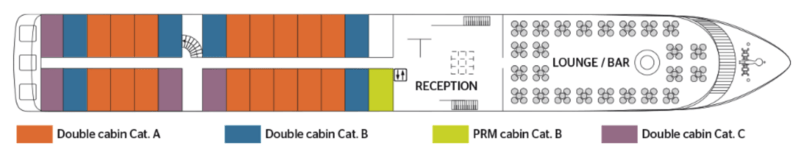 The CroisiEurope fleet, provides luxurious modern accommodation and facilities for 178 passengers. Of the 89 cabins, 40 double cabins can be found on the Upper Deck, 27 on the Middle Deck and 22 on the Main Deck.
