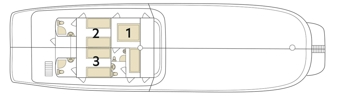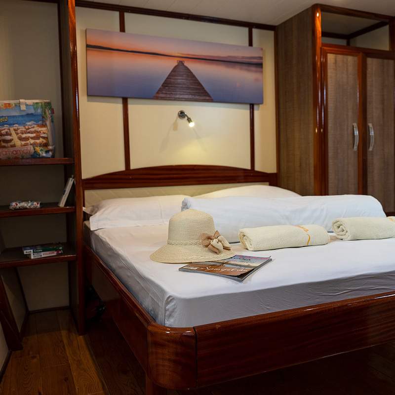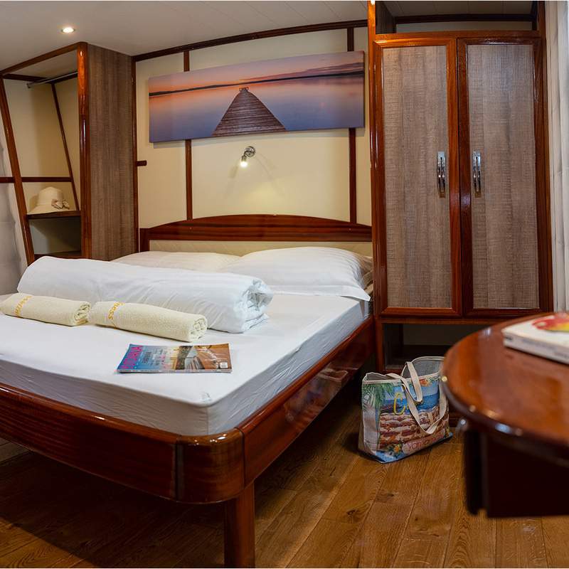 Your comfort is assured in fully air-conditioned cabins, with stylish furniture and contemporary lighting. Wooden flooring and a gleaming superbly appointed bathroom provide a touch of glamour and a home from home experience without compromise. All cabins feature either a double bed or twin beds and are equipped with dressing table and chair, wardrobe, hairdryer and bathroom with shower, plus free Wi-Fi on board. Lower and main deck cabins feature two fixed porthole windows, whilst cabins on the upper decks have one fixed porthole and one opening window.
