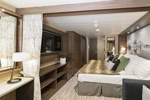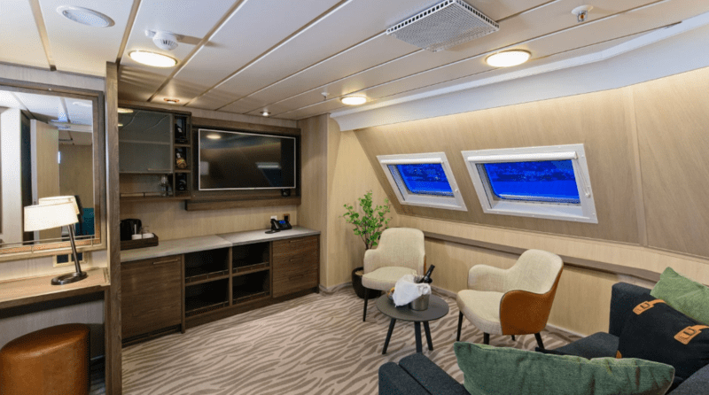– All staterooms and suites are fully upgraded to match Hurtigruten’s new standards. On deck 6, a number of cabins∘ were merged into larger suites, some with large bay windows and spectacular views.