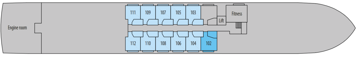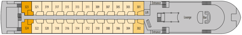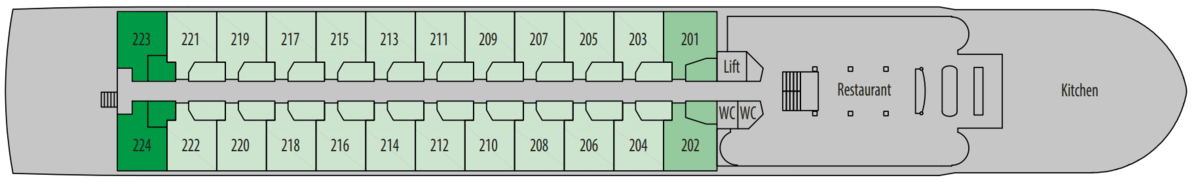 The spacious cabins are spread over 3 decks, with individually controlled air-conditioning, a contemporary bathroom with a rain shower and double or twin beds.Â