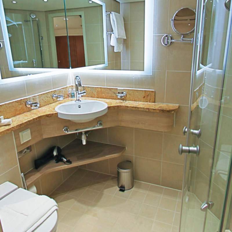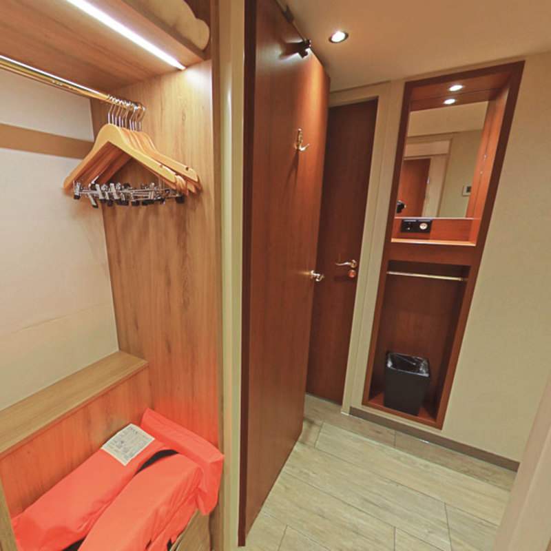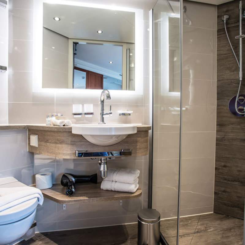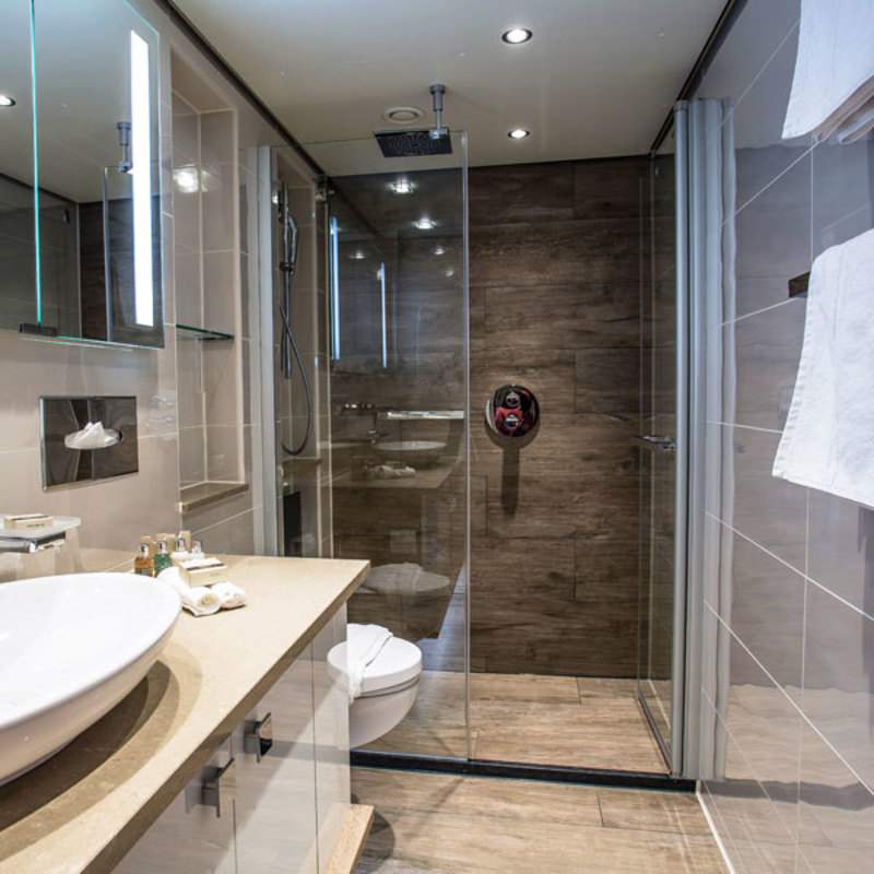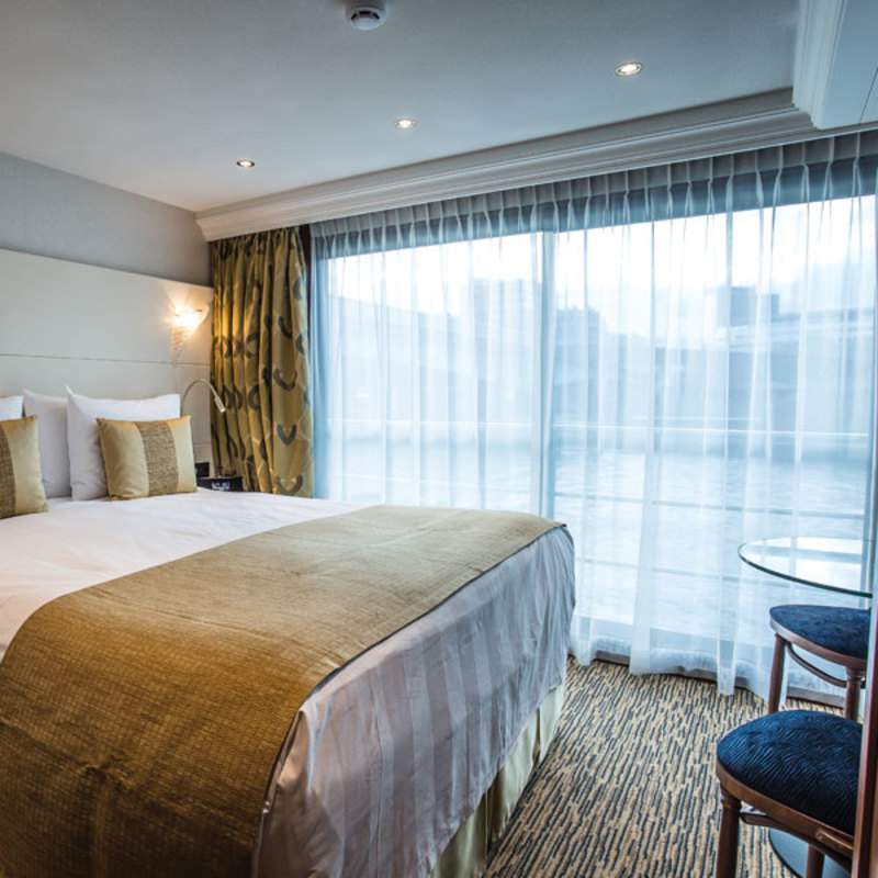 85% of the cabins have floor-to-ceiling windows with real French balconies. All cabins are equipped with in-room movies, minibar, adjustable climate control, private bathroom with shower and pampering toiletries.