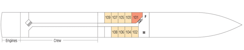 | Launch year | Refit year | Language | Length | Width | Currency | Capacity | Crew count | Deck count | Cabin count | Large cabin count | Wheelchair cabin count | Electrical plugs |