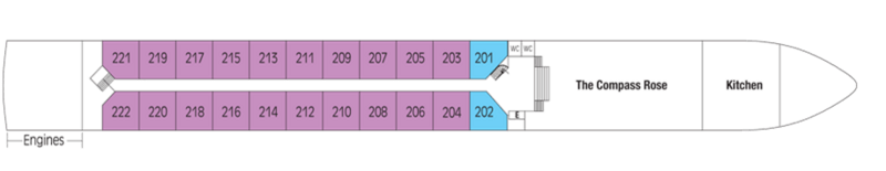 ms Sapphire has been redesigned with a new deck plan optimised for the utmost in spaciousness with over 70% of the cabins measuring 225 square feet or larger. The ship boasts 14 spacious 300-square-foot Suites, 20 225-square-foot cabins, four 183-square-foot cabins, one 182-square-foot cabin and eight-150-square foot cabins.