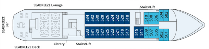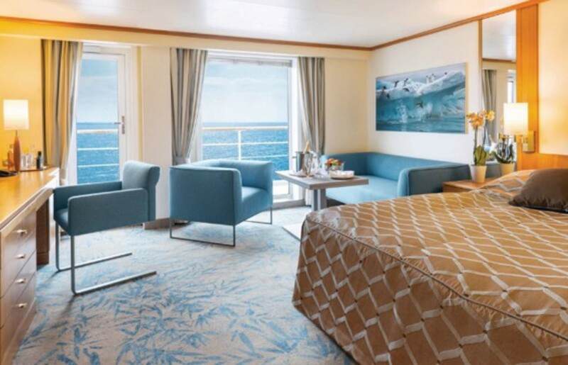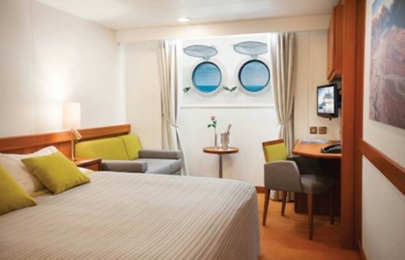 All cabins are sea-facing and tastefully decorated in contemporary light tones with classic nautical style wooden flourishes. Each is appointed with convertible twin/double beds as well as a separate seating area and private en-suite with shower. Amenities include flat-screen TV, telephone, safe, independent temperature controls and quality toiletries.