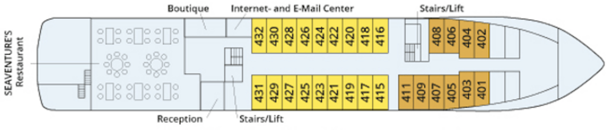 With a capacity of less than 160 guests and 90 crew and concierge, there is a less than 2:1 guest to crew ratio. So you’ll always have a friendly and professional member of the team waiting to make your MS Seaventure experience as special as it can be.