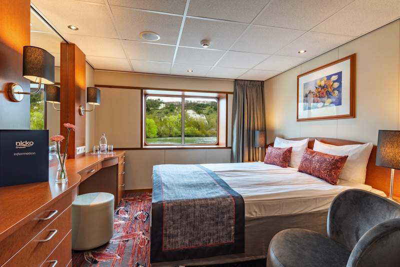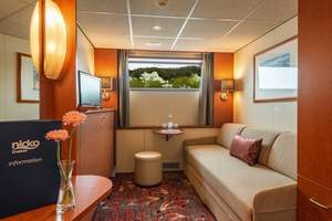 The cabins on MS Seine Comtesse are stylish and comfortable, with individually adjustable air conditioning, shower/WC, satellite TV, phone, hairdryer and safe. Cabins on the middle and upper decks are approx. 14 m² in size. Deluxe middle deck cabins have large, openable panoramic windows; deluxe upper deck cabins have a lowerable panoramic front. All other cabins on the middle deck have large, non-opening panoramic windows. Beds are arranged next to each other but can be separated if required. Main deck cabins are approx. 11 m² in size, and all have a non-opening viewing window, folding bed and sofa bed.