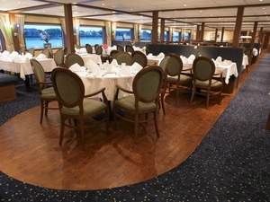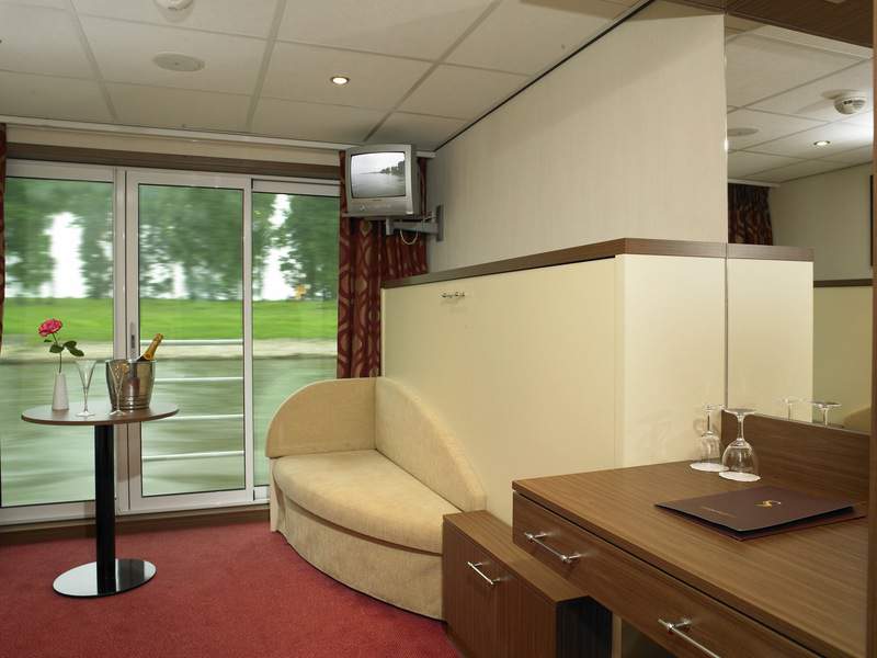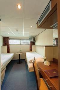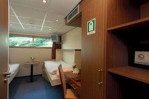 All cabins onboard the MS Serenity are exactly the same size and layout; the only difference is the outside view as detailed below. They all have a separate en suite with a good size shower, twin beds, air conditioning, radio, satellite TV, safe and a full size hairdryer. There’s also plenty of storage for your bags and suitcases, along with a good size wardrobe and a small desk and chair. The crew tend to them every day, folding up the beds to allow even more space, and providing fresh towels and drinking water.