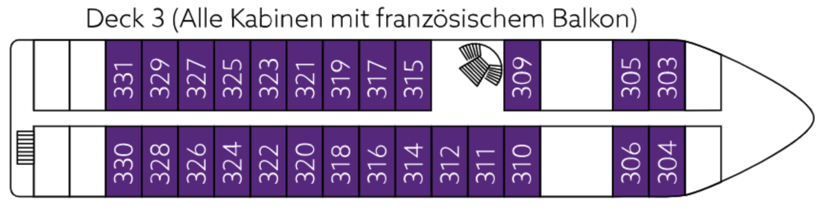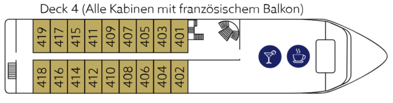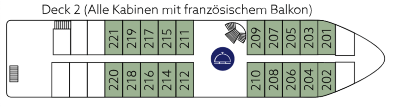 All cabins are stylishly furnished outside cabins. The double cabins are very spacious with 19 m². All cabins on deck 2, 3 and 4 have French balconies. All cabins have individually controlled air conditioning, shower/WC, hairdryer, SAT TV, refrigerator and a safe. The 2-bed cabins have a double bed with two separate mattresses.