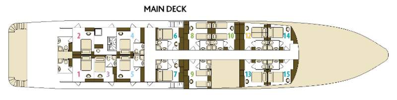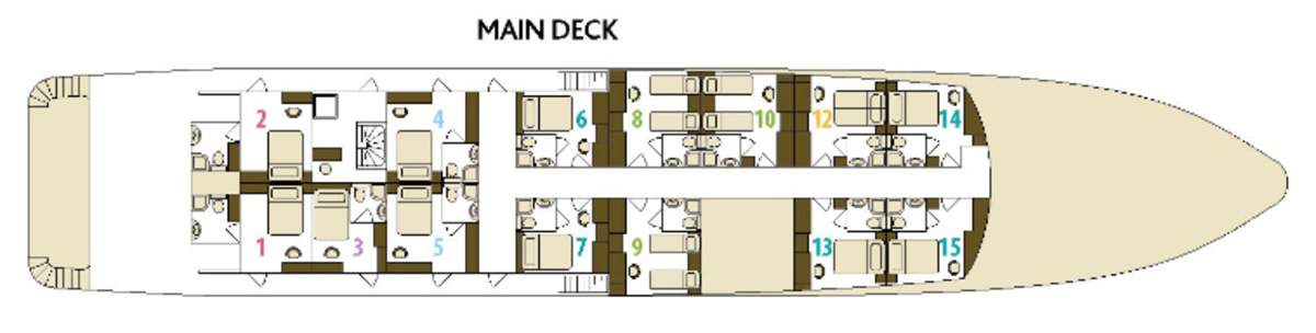 Superb attention to detail at every stage of the design process is evident throughout - from the light and spacious public areas, glamorous sundeck with shaded area, elegant air-conditioned restaurant and bar, and stylish terrace to the superbly equipped cabins, kitted out with all you need for a comfortable stay.