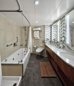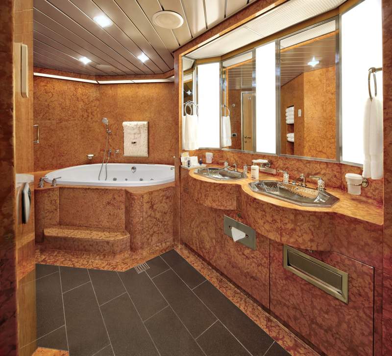 Generously proportioned and filled with light, these elegant suites include a living room, dining room, pantry with microwave and refrigerator, and floor-to-ceiling windows overlooking a private verandah with whirlpool. The bedroom features a king-size bed—our Signature Mariner's Dream™ bed with plush Euro-Top mattresses, plus a separate dressing room and the bath includes an oversize whirlpool bath and shower as well as an additional shower stall. There's also a sofa bed, suitable for two people, and a guest toilet. Amenities include a private stereo system, use of the exclusive Neptune Lounge, private concierge and an array of complimentary services.