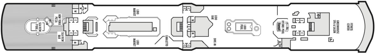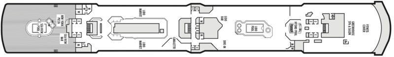 The Lido Pool is also located midship on deck 9. It has 3 hot tubs and is protected by a retractable glass dome cover during inclement weather. It is served by the Lido Bar and Trident Grill for light meals and has a bandstand for live entertainment.