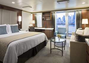 Filled with light from floor-to-ceiling windows overlooking a private verandah, these staterooms include a sitting area, two lower beds convertible to one queen-size bed—our signature Mariner's Dream™ bed with plush Euro-Top mattresses, and bath tub with premium massage showerheads.