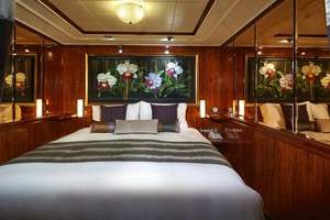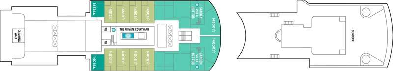 These Courtyard Penthouses make for an amazing cruising experience. Sleeps three, with a bedroom featuring a queen-size bed, luxury bath and shower and additional bedding to sleep one additional guest. Also features a living area, dining area, private balcony and access to the private courtyard area. Includes butler and concierge service.