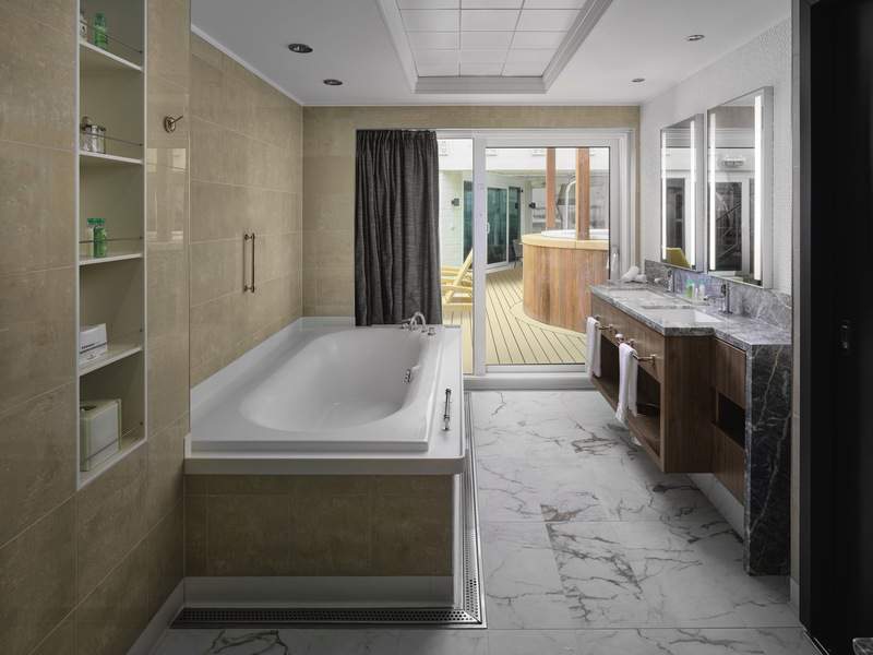 Up to three guests can enjoy the fabulous views from the aft-facing balcony of these Penthouses that include a queen-size bed plus a single sofa bed, luxurious bath with shower, a sitting area, and some even have a living and dining area. Includes butler and concierge service in select cabins.