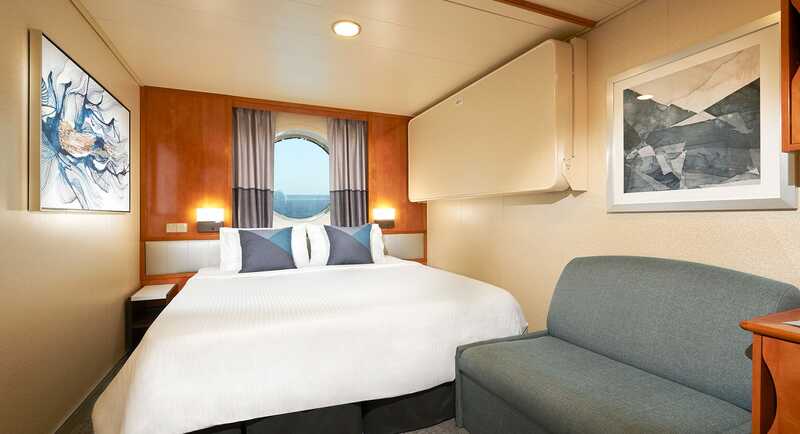 These staterooms feature a large round window and a queen-size bed. Staterooms are priced exclusively for solo travelers.