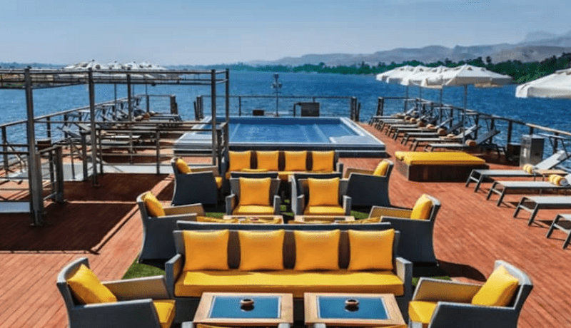With only 22 cabins and suites, Oberoi Philae offers spacious private accommodations with standard luxury cabins (284 sq. ft.) and luxury suites (538 sq. ft.), large windows framing panoramic Nile River views; ship amenities include a spa, fitness center, swimming pool, bar / lounge, cinema, elevator, high-speed wifi, library, and gaming area.