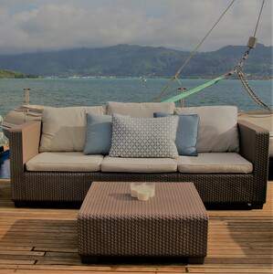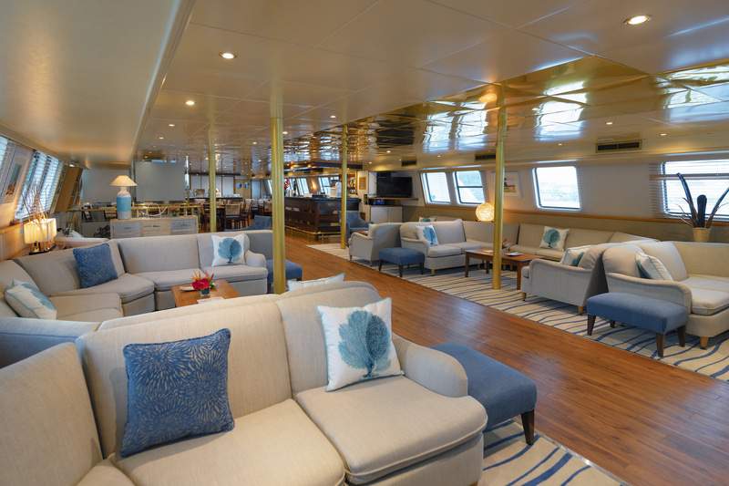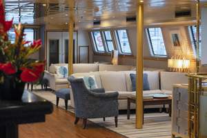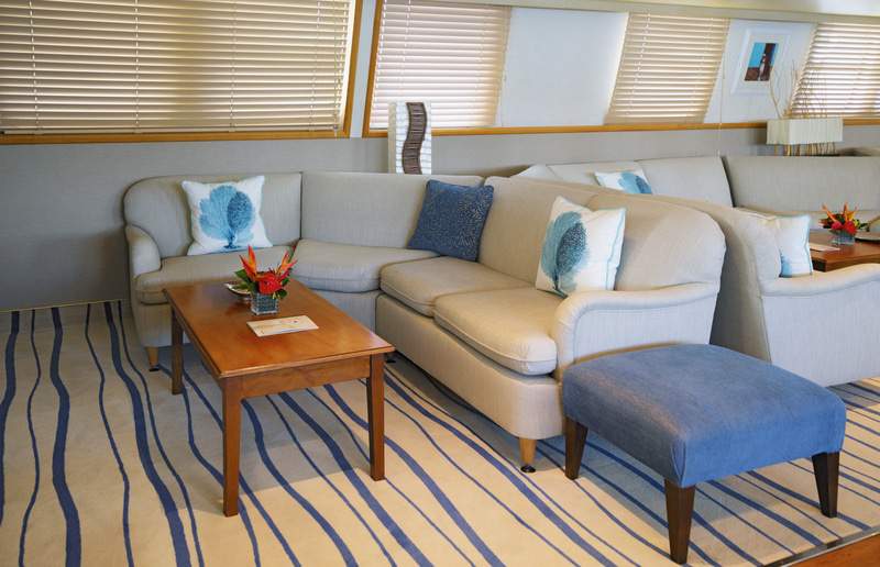 A spacious lounge with ample space, dining areas decorated with warm colours, large windows offering pristine views of all destinations, shaded areas and outdoor bar and loungers are just some of the elements that define her essence. 360° views of unobstructed ocean are your eyes’ canvas painted with ocean blue and deep green mountains.