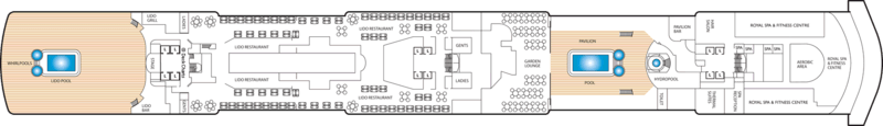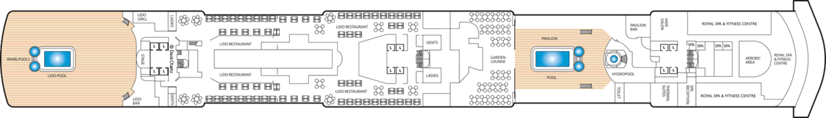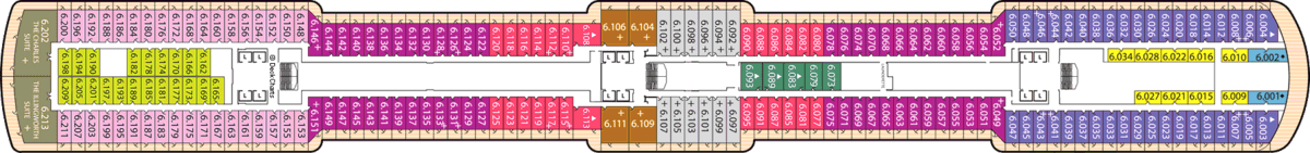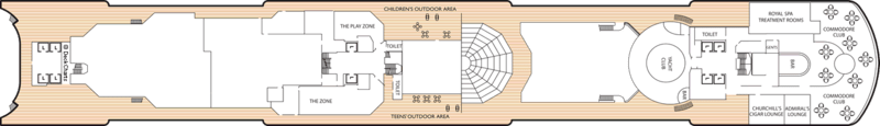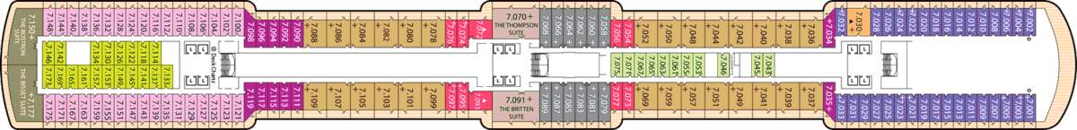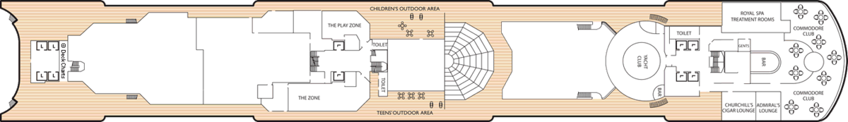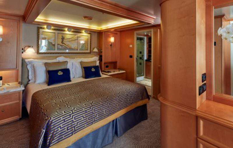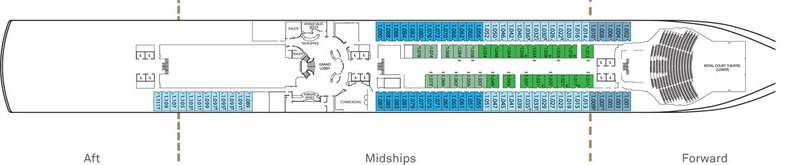 There are nine different types of suites and staterooms available onboard: Grand Suites, Master Suites, Penthouses, Queens Suites, Princess Suites, Britannia Club, Balcony, Outside and Inside.