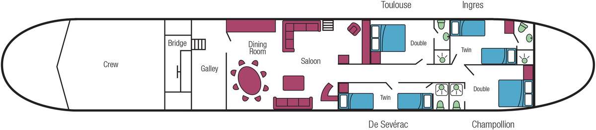 Rosa is an old Dutch “Clipper” barge that was completely refitted in 2010 to a high specification. The air conditioned interior includes a dining room, saloon, bar and four staterooms. Two of the staterooms have double beds and two have twin beds, all of which have full en-suite facilities. Outside there is a spacious sun deck with comfortable furniture.