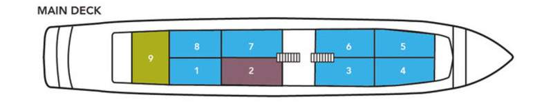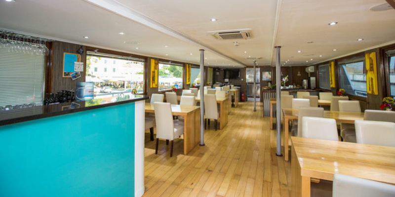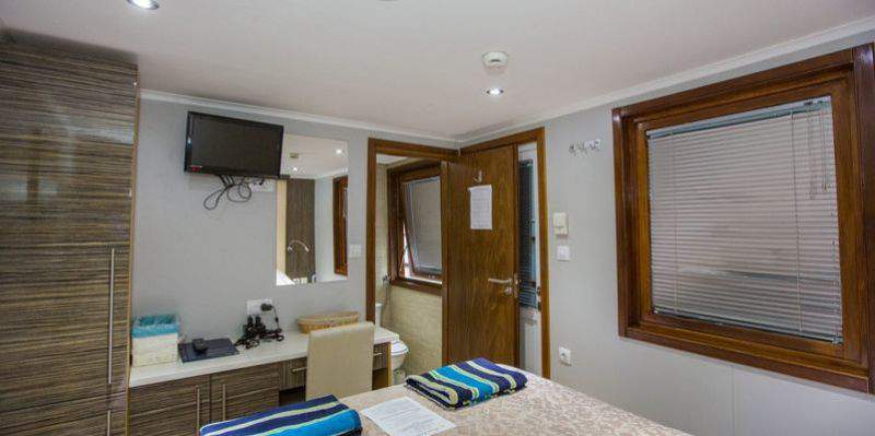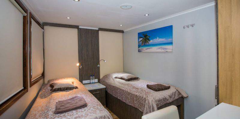 The 16 cabins are each equipped with a safe, air conditioning/heating, hair dryer and a flat screen TV. Each cabin also has an en-suite bathroom with shower.