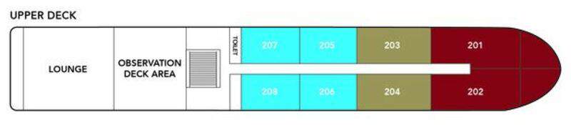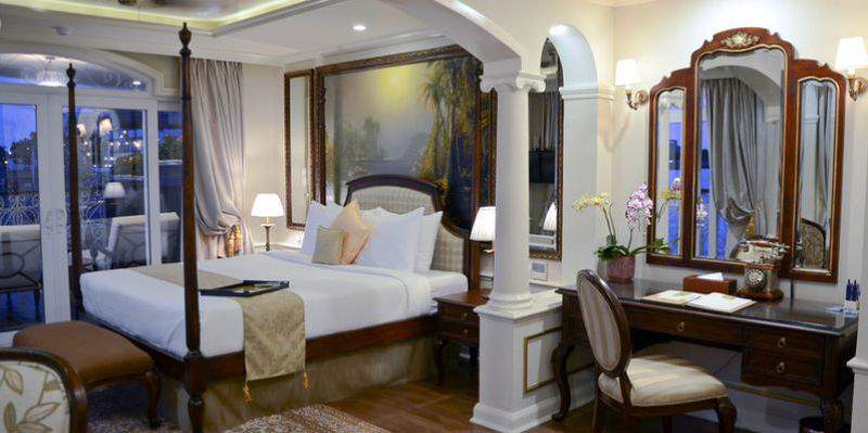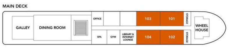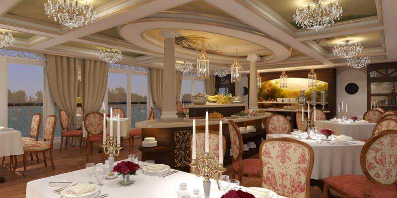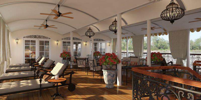 The 12 spacious suites are attractively furnished and feature panoramic floor to ceiling French doors. The cabin’s décor combines the elegance of French-colonial style with the tranquillity, comfort, modern convenience and luxuries which would rival the finest hotels in Asia. Cabins feature individual climate control, premium mattresses, duvets and bed linens, choice of pillows, comfortable seating areas, generous storage, in room safe, ceiling fans and desks. Spa robes, slippers and specially selected, spa bath amenities are also provided for your comfort and convenience. A flat screen television with on-demand system in each suite offers popular, classic and destination-related movies and international print news is delivered to your suite daily.