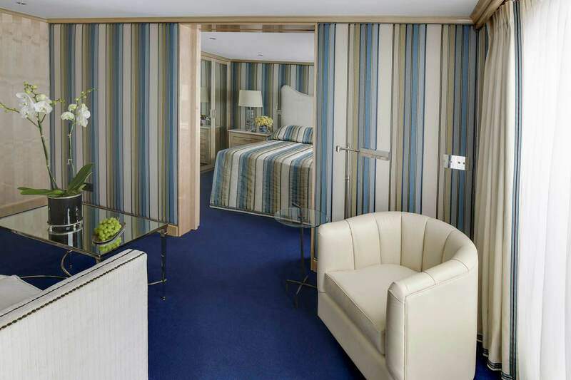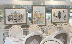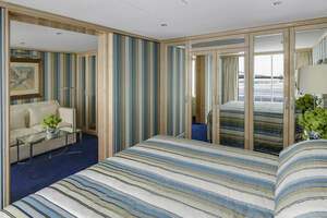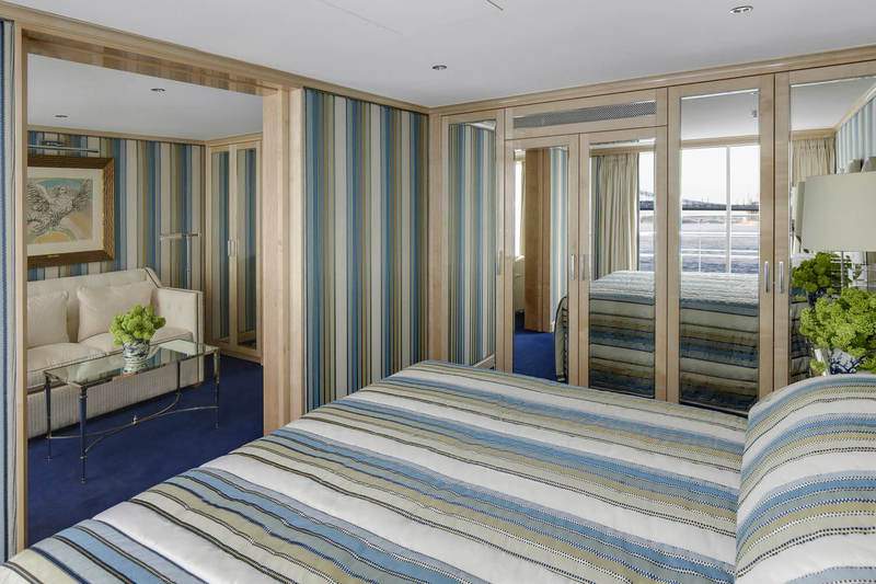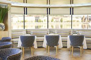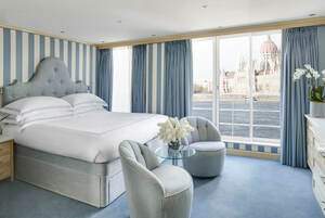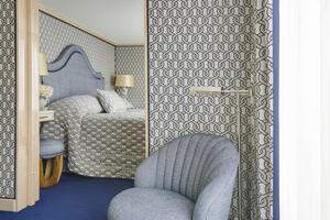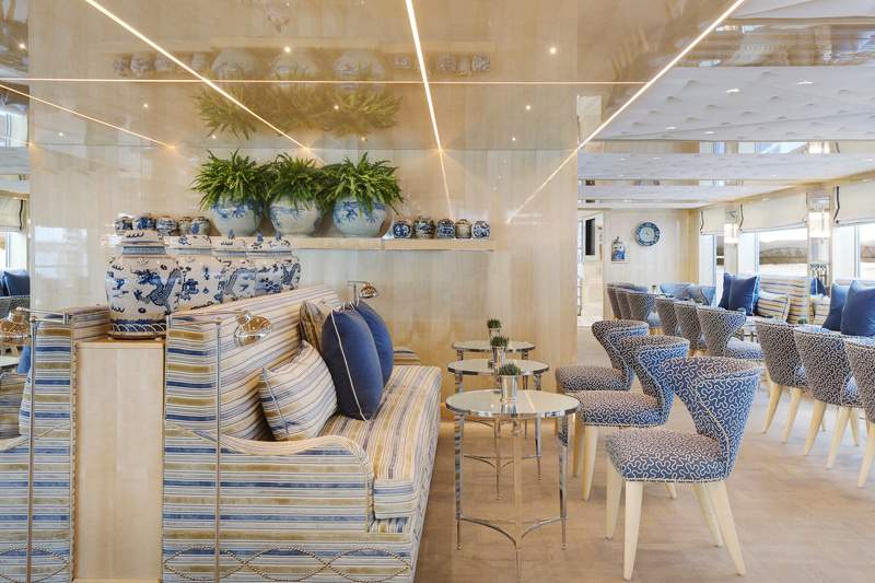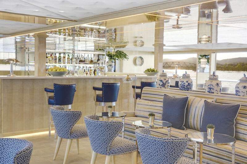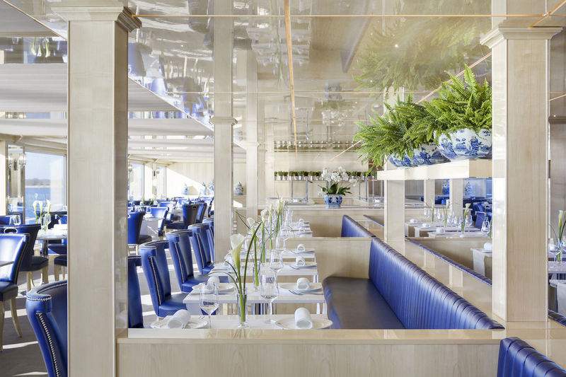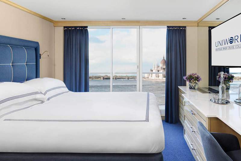 The S.S. Beatrice boasts yacht-style light wood with blue and white finishes throughout, a renovated lobby featuring elegant mirrors, marble floors, a white Murano chandelier with blue shades and a grand staircase made of nickel and black iron—a signature design element of Uniworld’s Super Ships. The ship’s redesigned lounge features sofas and chairs with hand-made upholstery, a parquet floor and upholstered ceiling panels, solar shades and new USB ports allowing guests to charge anywhere they are sitting. The artwork throughout the ship includes pieces from Pablo Picasso, Alexander Calder and Pino Signoretto.