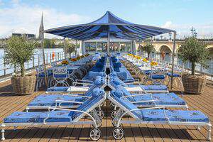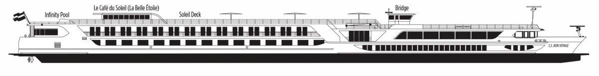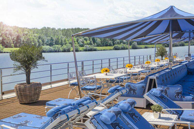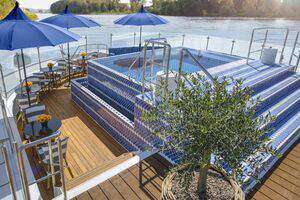 The stunning Soleil Deck, awash in vibrant fabrics, features the only infinity pool on the rivers and spectacular views of the French countryside. Poolside service at Le Café du Soleil offers casual French cuisine as well as open-air cooking demonstrations from our chefs.