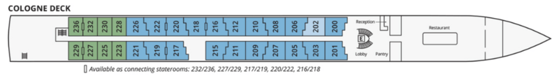 All staterooms have Open-Air Balconies that, with the touch of a button, will lower the glass halfway to create a balcony-like effect. Adjoining staterooms are available; please inquire at the time of booking. While the S.S. Elisabeth is a beautiful and luxurious ship, its amenities may differ slightly from those of a Uniworld-company-owned ship.