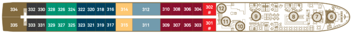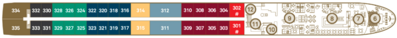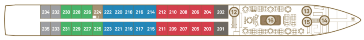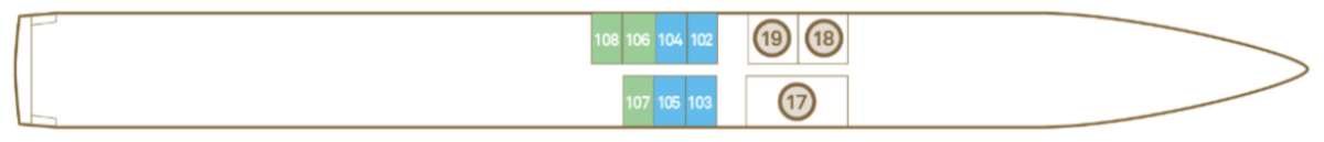 | Launch year | Refit year | Language | Gross tonnage | Length | Currency | Capacity | Crew count | Deck count | Cabin count | Large cabin count | Wheelchair cabin count | Electrical plugs |