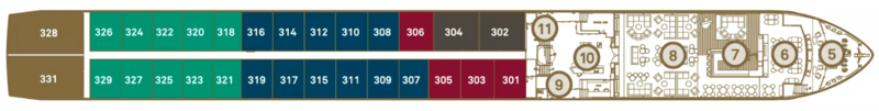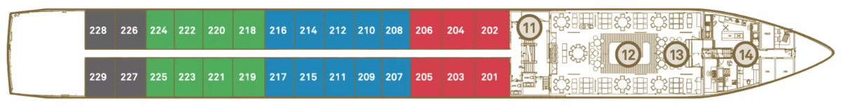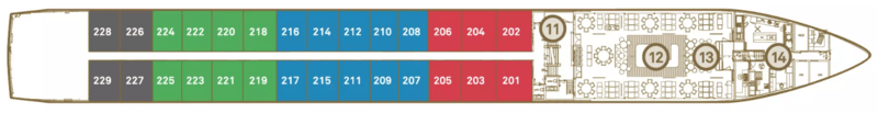 | Launch year | Language | Gross tonnage | Length | Currency | Capacity | Crew count | Deck count | Cabin count | Large cabin count | Wheelchair cabin count | Electrical plugs |