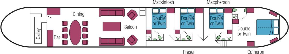 On board you will find four en-suite cabins each with a choice of twin or double beds. One of the cabins is a larger suite which has been designed for those who want extra space during their cruise. Cuisine is traditional Scottish fare – salmon, game and seafood, prepared by your own Master Chef, and the hotel barge’s experienced crew of four will take care of your every need.
