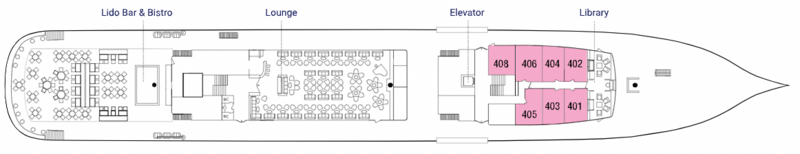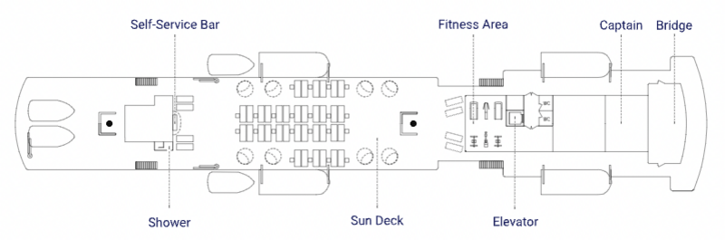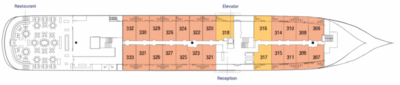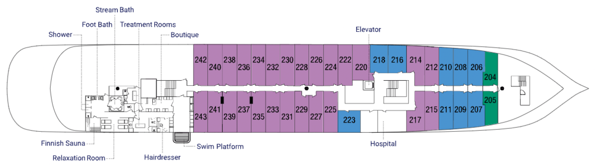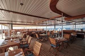 Public areas: Restaurant (180° panoramic view) with free seating and one sitting, lido bar and bistro, lounge with Steinway grand piano, library with comfortable sitting area, sun deck with sunbeds and shower, boutique, hospital, WI-FI.