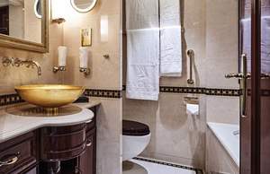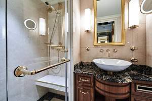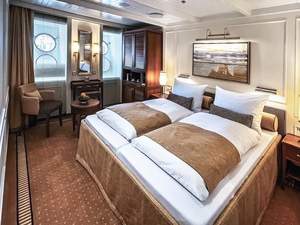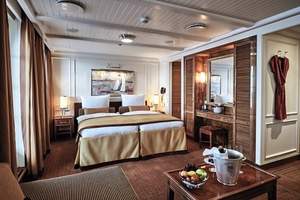 Cabin equipment: Bathrobes, hair dryer, telephone, adjustable A/C, private safe, minibar, coffee machine, TV with entertainment system, WI-FI, exclusive cosmetics, dressing table, and bureau.