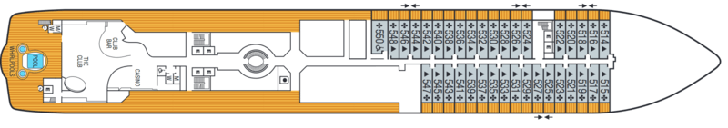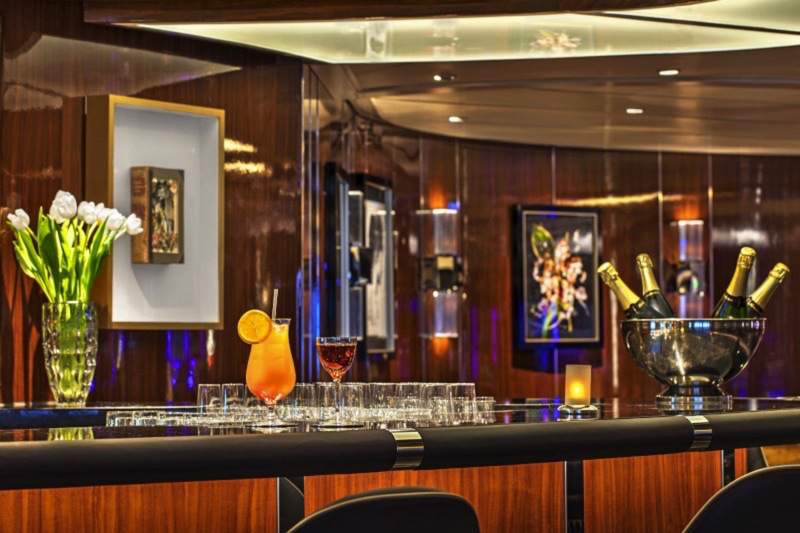 The liveliest lounge on board is the scene of daily afternoon tea service. It is a popular spot for pre-dinner drinks and dancing to live music. After dinner, the dancing music continues, and later a DJ spins dance music until late at night. Another terrace of open deck aft of The Club boasts a plunge pool and two small whirlpool spas.