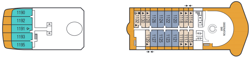 Located on Deck 11; total inside space of between 639 and 677 square feet (59 and 63 square meters) plus veranda of between 254 and 288 square feet (24 and 27 square meters)