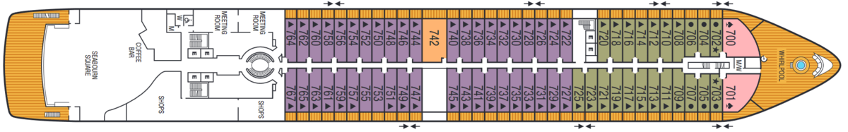 Located on Deck 7, 8, 9 and 10; total inside space of between 576 and 597 square feet (54 and 55 square meters) plus veranda of between 142 and 778 square feet (13 and 72 square meters).