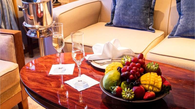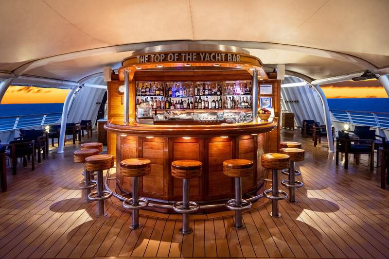 Dream gourmet cuisine harmonized with rich and colorful wine flavors enhances the overall gourmet dining experience. Inclusive wine pairings are thoughtfully selected to please your gastronomic palate. An open bar with select brands is available throughout the day, with beverages served upon request anywhere on board, including the Top of the Yacht Bar, featuring 360° views of the surrounding landscapes and seascapes. The Pool Bar offers refreshing beverages throughout the day and the Main Salon is enjoyed by guests for pre-dinner cocktails. After dinner service, the Piano Bar and Casino is a favorite locale for a nightcap.