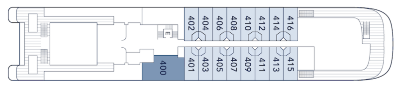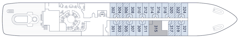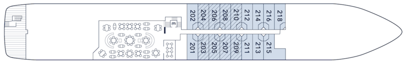 Launch year | Refit year | Language | Gross tonnage | Length | Width | Currency | Speed | Capacity | Crew count | Deck count | Cabin count | Large cabin count | Wheelchair cabin count | Electrical plugs |
