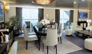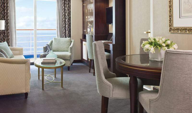 You'll find Park Avenue chic onboard Seven Seas Navigator® in this spectacular suite. Elegant rosewood furniture, luxe fabrics and a crystal chandelier create sophisticated comfort, while a personal butler is available to fulfil whatever requests you may have. With one bedroom, two-and-a-half baths, a large living room and two private balconies, this sublime suite is perfect for hosting new friends in luxury.