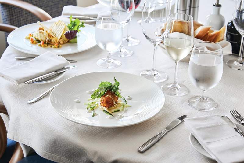 Soft breezes and ocean views beckon at the Grill, especially as the sun goes down when cruise guests gather for cocktails at the outdoor bar and talk about the day’s events.