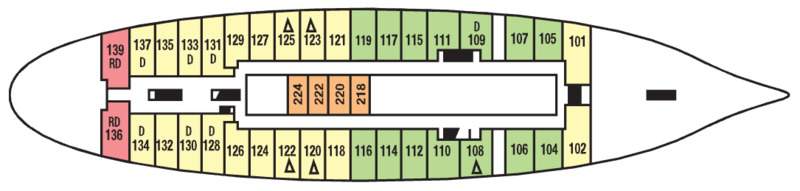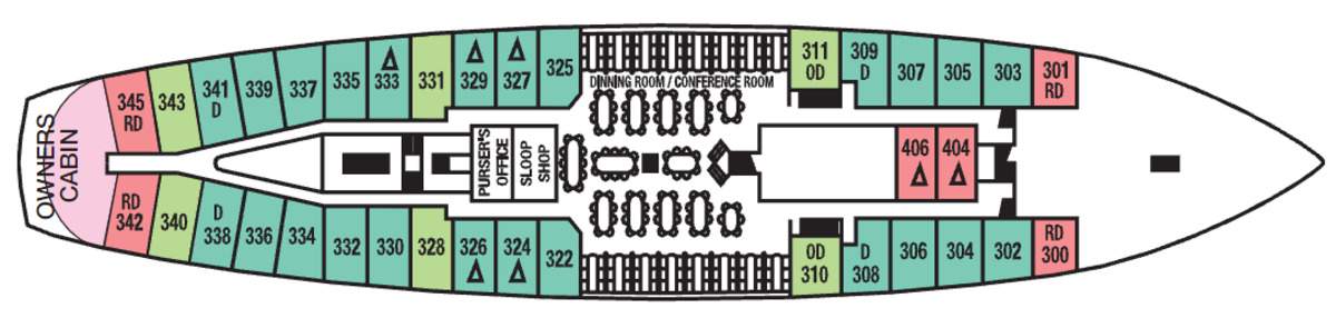 With amble outdoor space for a full capacity of 170 guests and sizeable cabins, complete with all the mod-cons, you will never feel cramped aboard this excellent ship. In fact, because we abolish any rigid schedules or clothing and dining restrictions, you will feel as liberated as ever as the salty sea breeze rushes through your hair.
