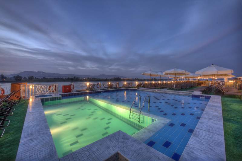 A large, luxurious lounge serves drinks and snacks all day. Cool off in the swimming pool on the Sun deck or take time out in the beauty salon (open on request in Luxor or Aswan twice a week) or visit the gift shop on board. If you feel more active, fitness equipment are also available.