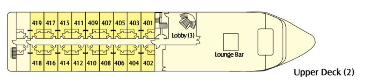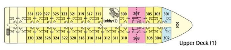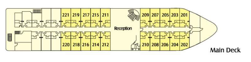 74 large double cabins and two Suites are located on the first four decks of this five deck vessel. The suites offer very comfortable and spacious seating and living areas with plenty of storage space.