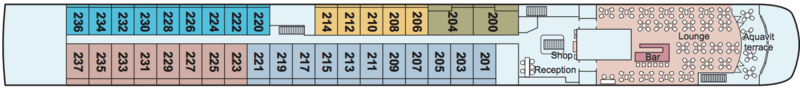 Launch year | Language | Gross tonnage | Length | Width | Currency | Speed | Capacity | Crew count | Deck count | Cabin count | Large cabin count | Wheelchair cabin count | Electrical plugs |